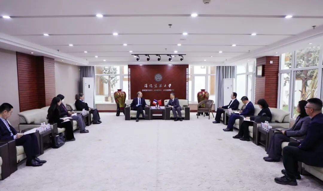 郭长义对法国驻沈阳总领事馆长期支持学校发展建设表示感谢。他指出,我校以建筑、土木为核心学科,与法国高等教育渊源深厚——从巴黎美术学院体系影响我国早期建筑教育,到近年双方在文化教育、人才培养、科研协作等领域的务实合作,均为此次“自然建筑展”奠定了坚实基础。他强调,学校始终响应国家“双碳”战略与绿色建筑需求,依托学科优势搭建国际交流平台,希望未来与法国驻沈阳总领事馆从三方面深化合作:一是教育领域升级师生交流、深化联合培养;二是科研领域聚焦自然建筑、构建协同创新机制;三是文化领域加强研讨、推动交流常态化。